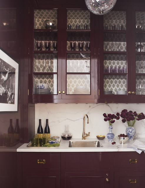 | Such a rich colour on the cabinets! The marble texture anchors the small pattern in the cabinets nicely. Image: Ashley Whittaker Design |